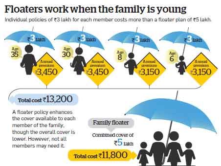 class=>Rakesh Somani, 34, is looking for a health cover for his family, including his wife Ruchita, 30, and sons Rudraksh, 8, and Raghav, 2. Individual covers of Rs 3 lakh each will cost him Rs 13,200 a year. A floater cover of Rs 5 lakh will cost him Rs 11,800 a year. One of the biggest dilemmas faced by health insurance buyers is whether they should go for individual policies or a floating cover for the entire family. In an individual policy, the cost of the cover is generally lower compared with a floating plan.However, in the case of the latter, a higher cover is available to all members of the family since each member can avail of the combined cover. The logic is simple. There is a low probability that more than one or two family members will require hospitalisation in a year. It is a calculated risk which reduces the cost of the cover substantially.